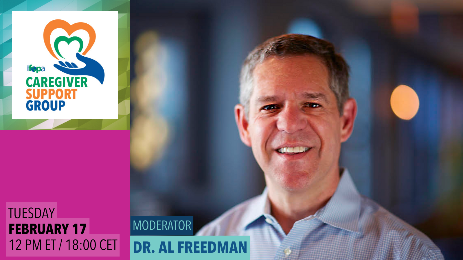 The Caregiver Support Group meets monthly from Noon to 1 pm ET / 18:00 to 19:00 CET.